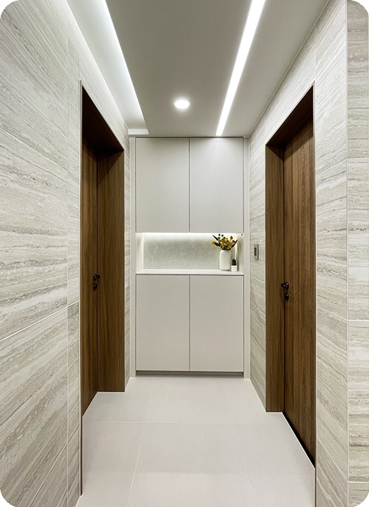 프로젝트의 시작은 고객님과의 소통에서 시작되었습니다. 오랜 세월 사용한 기존 문틀이 인테리어에 부정적인 영향을 미친다고 판단하신 고객님은 교체를 결심하셨습니다. 특히, 현대적이고 세련된 디자인을 원하셨고, 두꺼운 문틀이 공간을 답답하게 만드는 문제가 있었습니다. 이러한 니즈를 반영하여 저희는 자연스러운 무늬목 질감의 고급스러운 문색상과 벨로체 슬림 문틀을 제안드렸습니다.